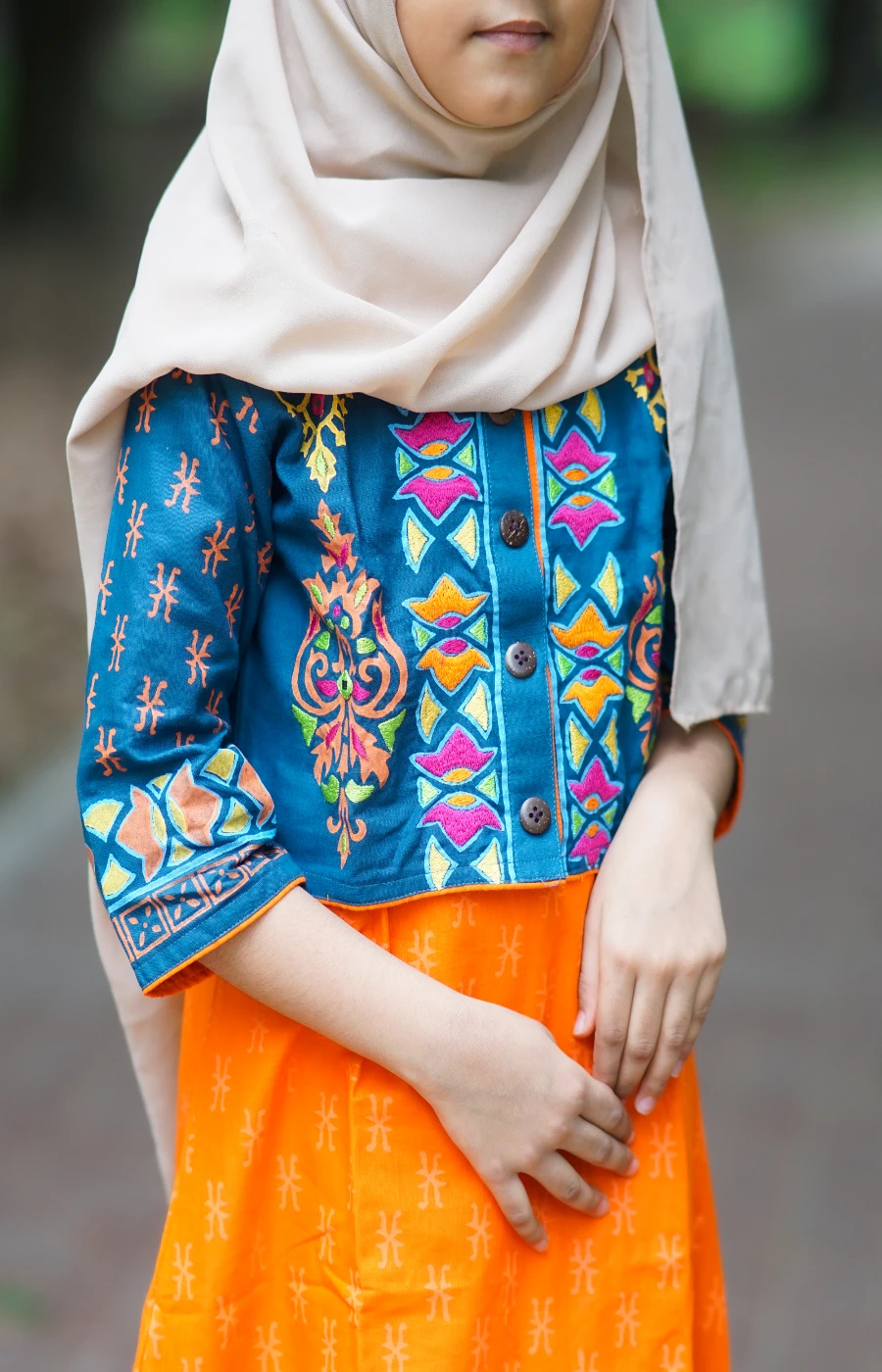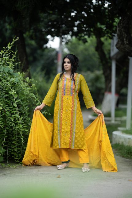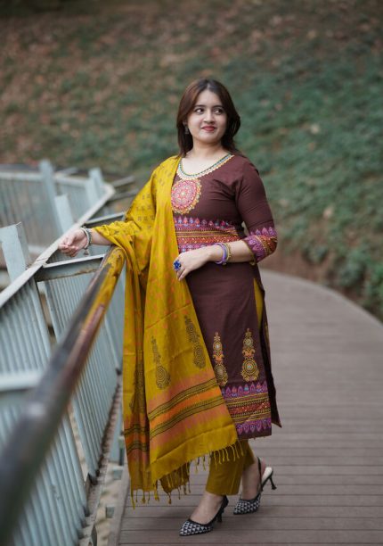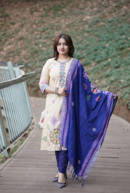 কাজঃ স্থায়ী ব্লক প্রিন্ট ও এমব্রইয়ডারির অসাধারণ কাজ করা হয়েছে।