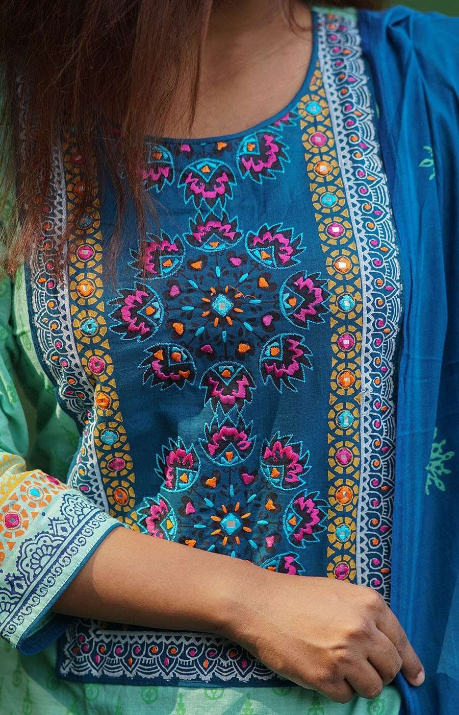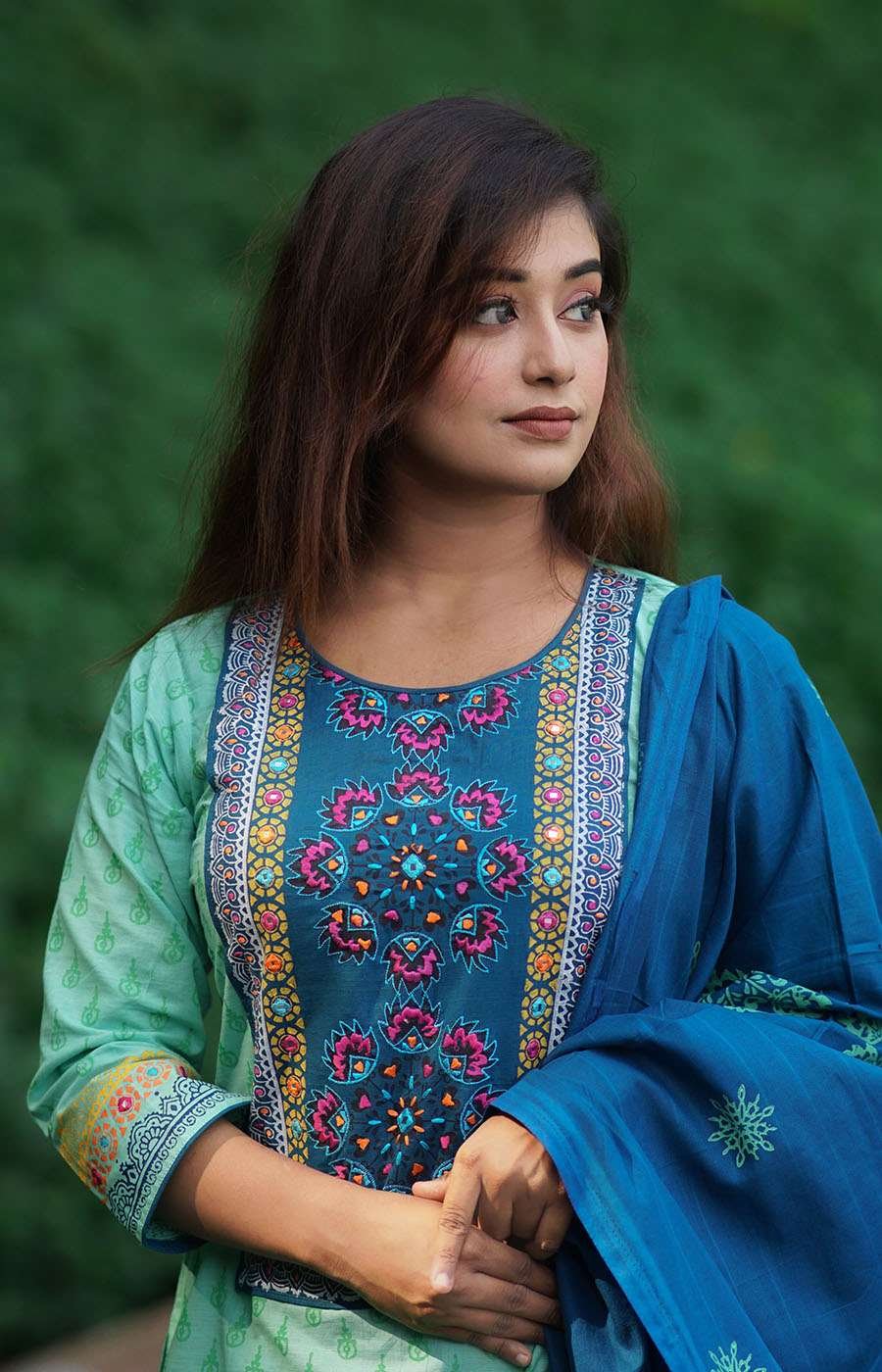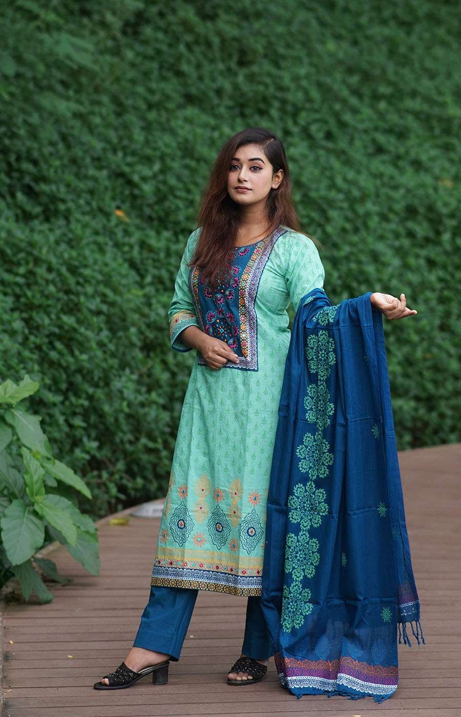 কাজঃ স্থায়ী ব্লক প্রিন্ট ও এমব্রইয়ডারির অসাধারণ কাজ করা হয়েছে।