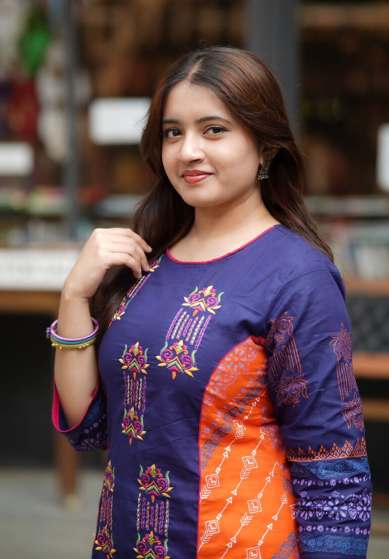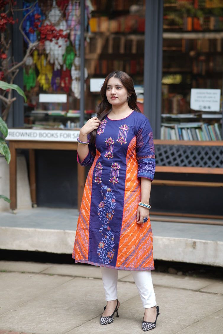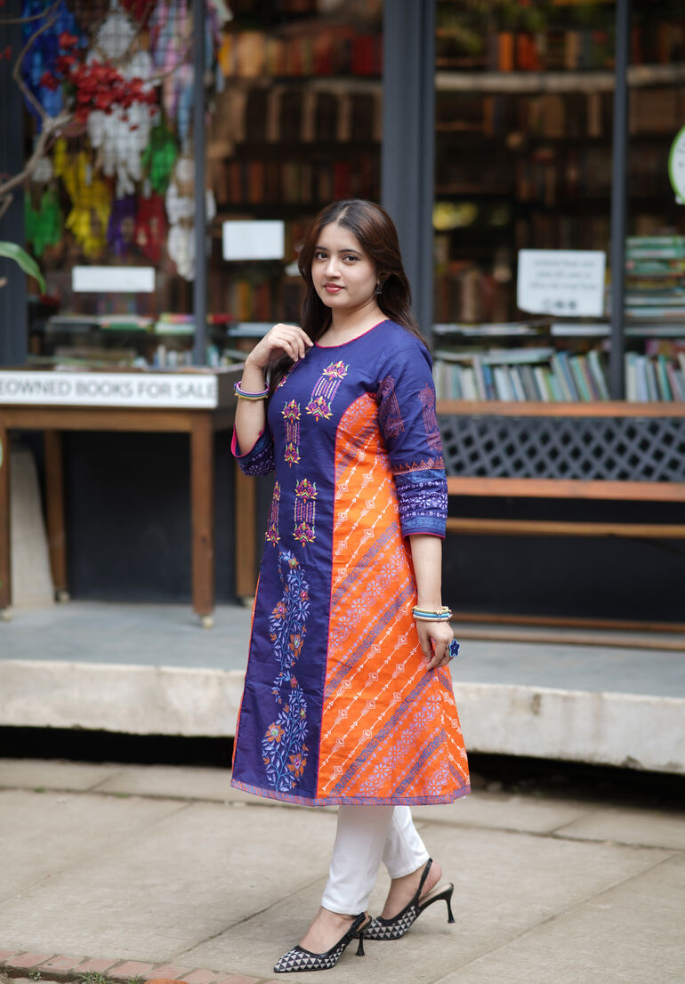 কাজঃ স্থায়ী ব্লক প্রিন্ট ও এমব্রইয়ডারির অসাধারণ কাজ করা হয়েছে।