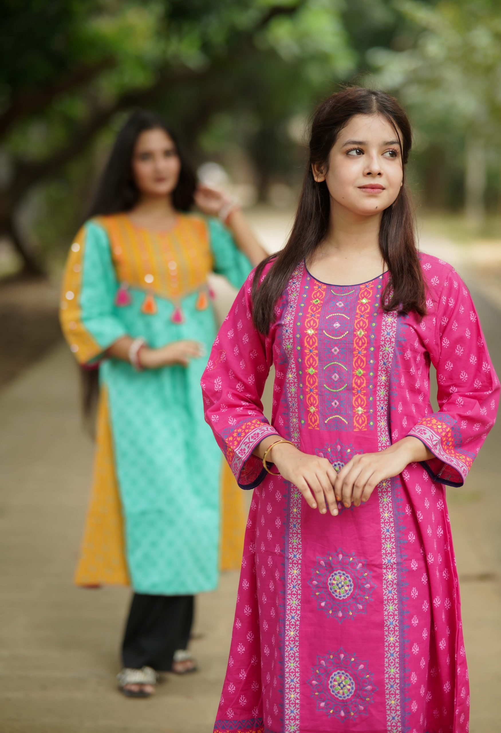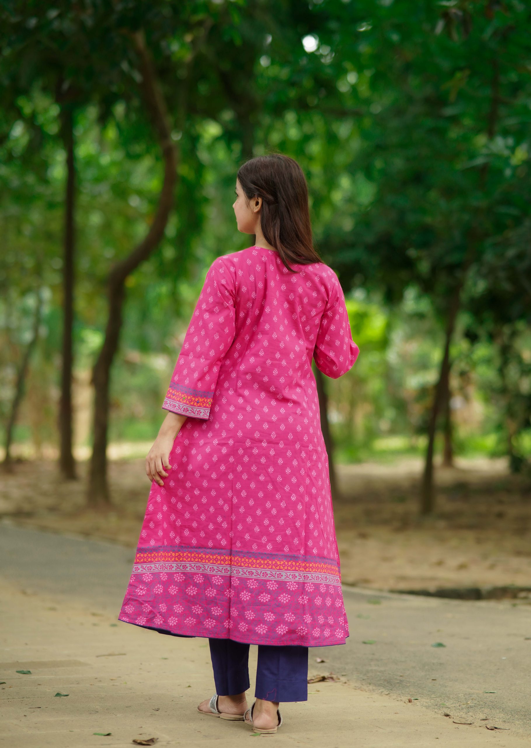 কাজঃ স্থায়ী ব্লক প্রিন্ট ও এমব্রইয়ডারির অসাধারণ কাজ করা হয়েছে।