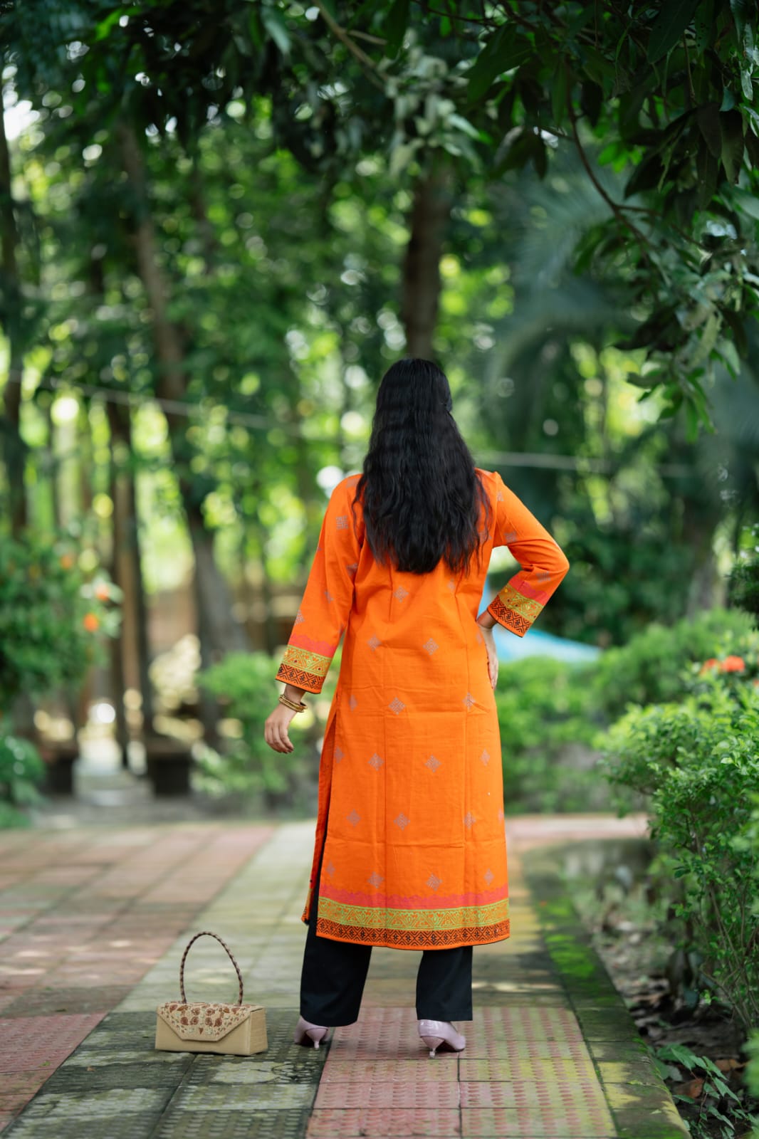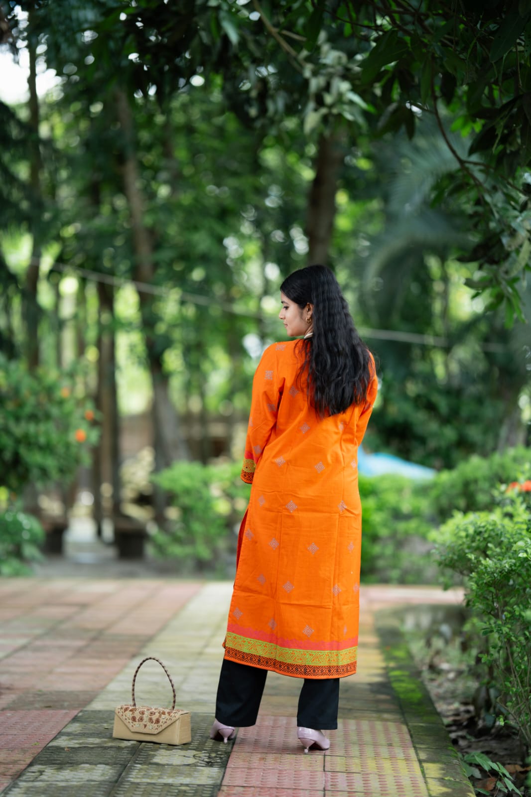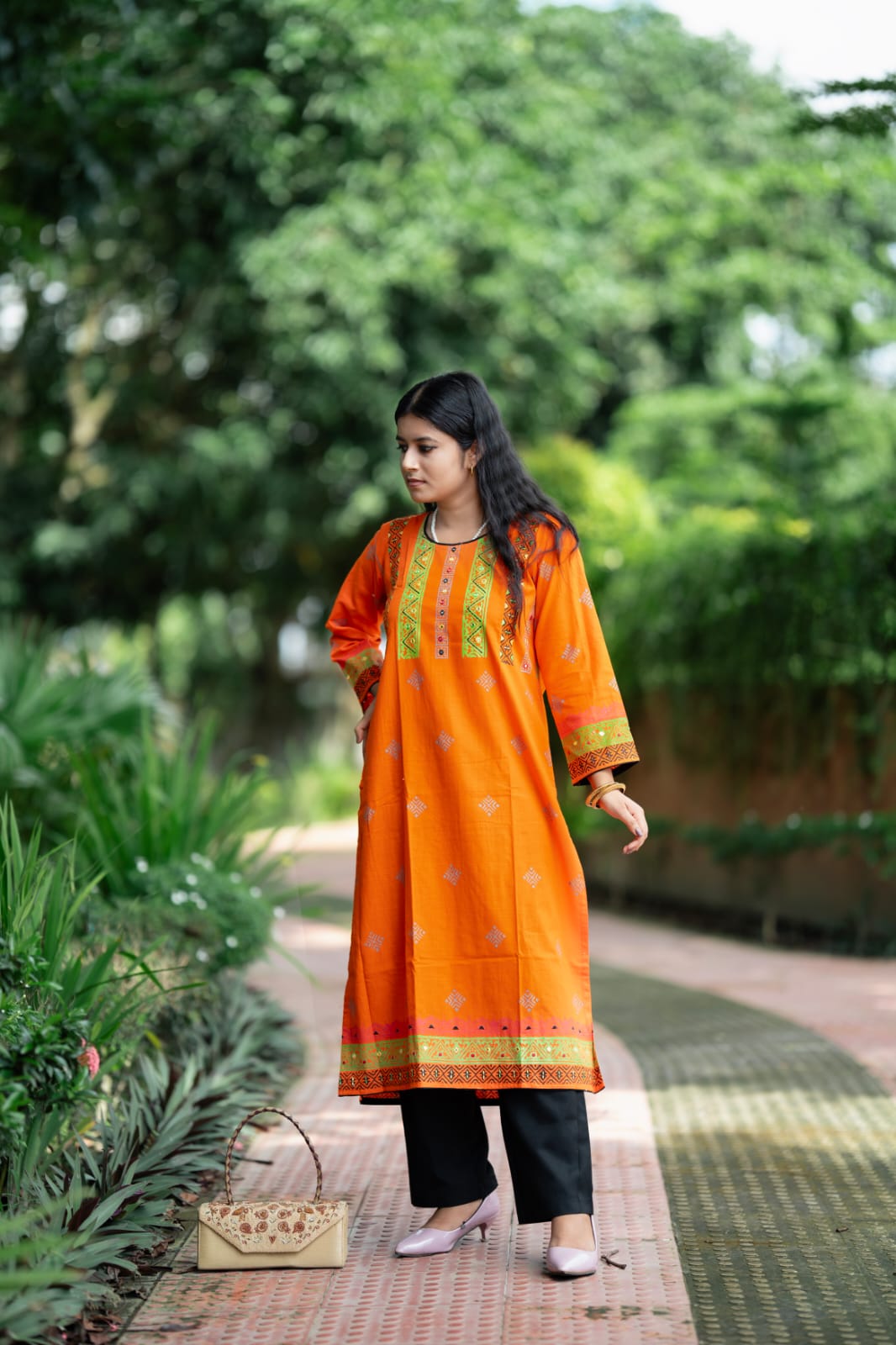 কাজঃ স্থায়ী ব্লক প্রিন্ট ও এমব্রইয়ডারির অসাধারণ কাজ করা হয়েছে।