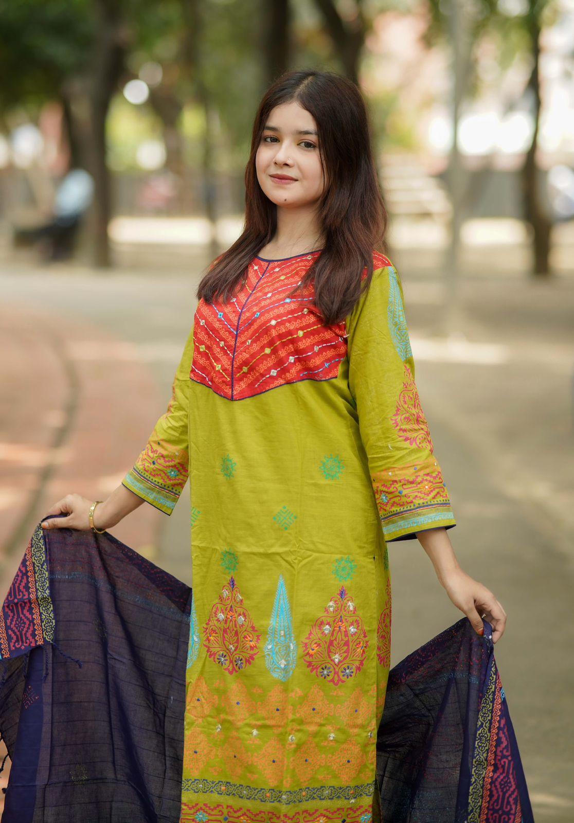 কাজঃ স্থায়ী ব্লক প্রিন্ট ও এমব্রইয়ডারির অসাধারণ কাজ করা হয়েছে।